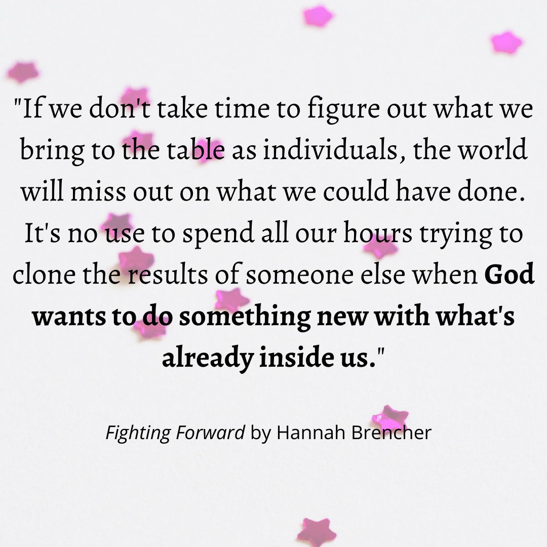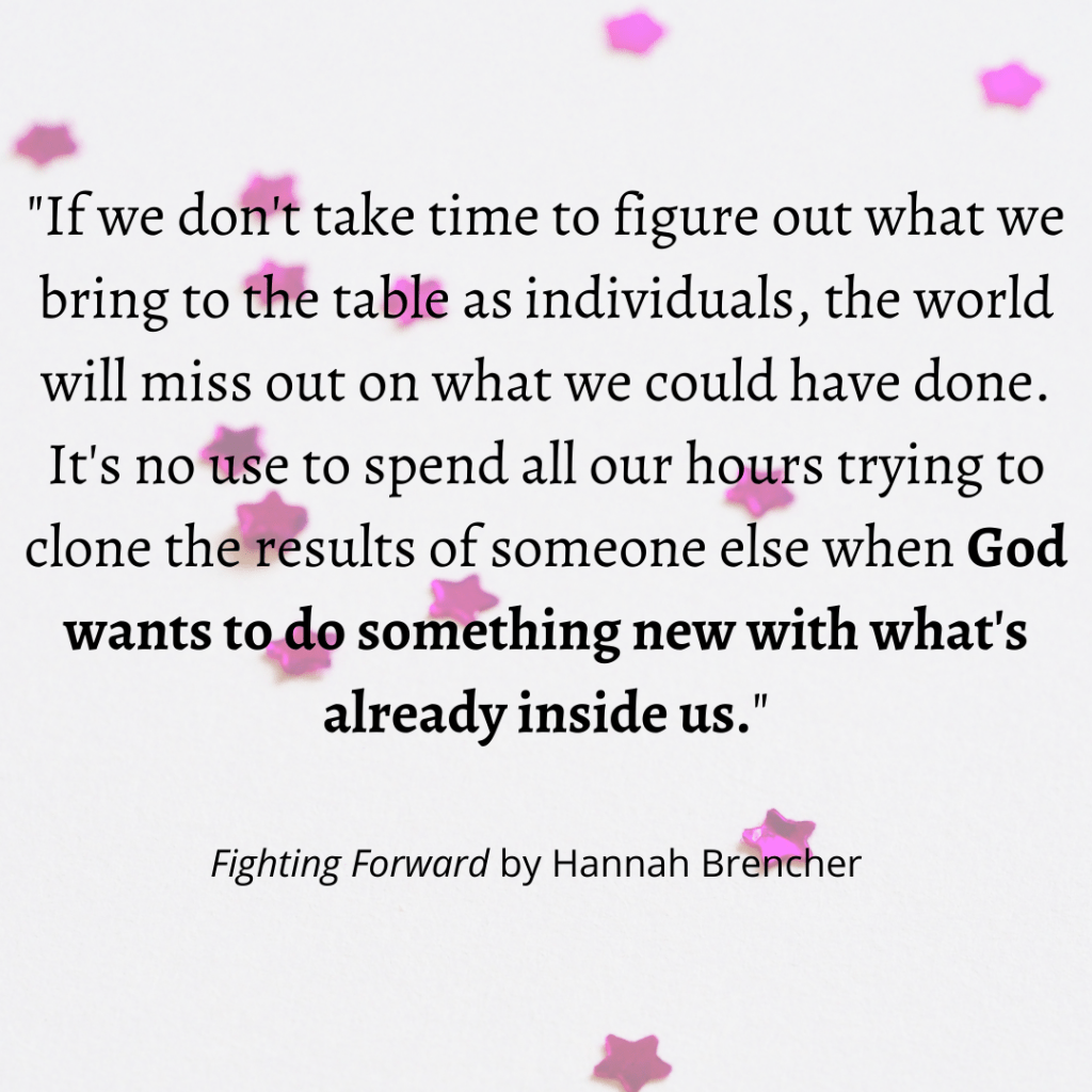“It may seem bleak. But God knew you could be in this fight, and he knew the outcome of the fight before you stepped in.” (85)