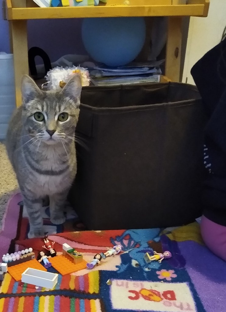 One day I had had enough so we moved the dryer and sent her into the girls room to live. After just a week in the girls room, she was sleeping in bed with them, and letting them snuggle her whenever they wanted. She even loved our three year old son who was not gentle, quiet, or slow. And now, four months later, she wanders out to the living room every morning to hang out with us while we eat breakfast. She plays in the hallway during the day, and when my husband works from home, she is a lovely sleeping coworker on the floor beside him.
