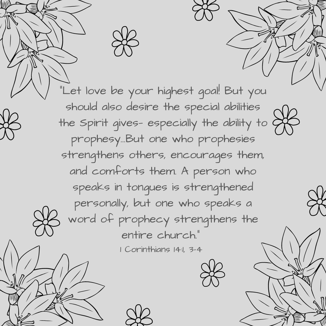 According to Paul, prophecy is to strengthen, encourage and comfort, not to tear down or destroy. When we listen to the Lord, and truly hear the promptings of the Holy Spirit, whatever we speak will build up, not break down. That’s not to say it won’t sometimes be hard for the person to hear, but it will always strengthen them, encourage them, and/or comfort them. And if we’re truly speaking to others in the Spirit, love will always be the highest goal!